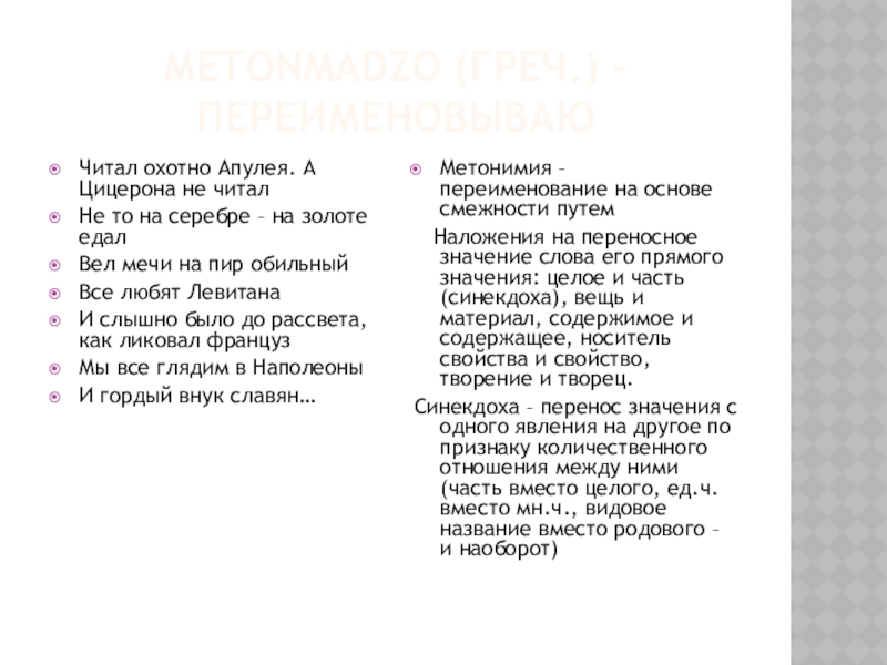 Наложения на переносное значение слова его прямого значения: целое и часть(синекдоха), вещь и материал, содержимое и содержащее, носитель свойства и свойство, творение и творец.