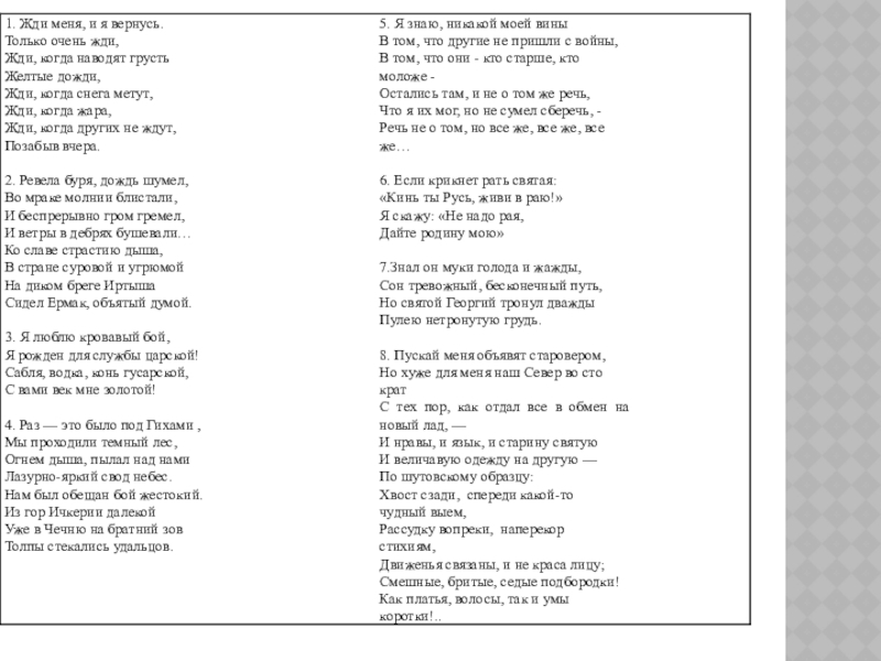 Повторяется строфа, размер стиха, рифма, синтаксические конструкции, слова.