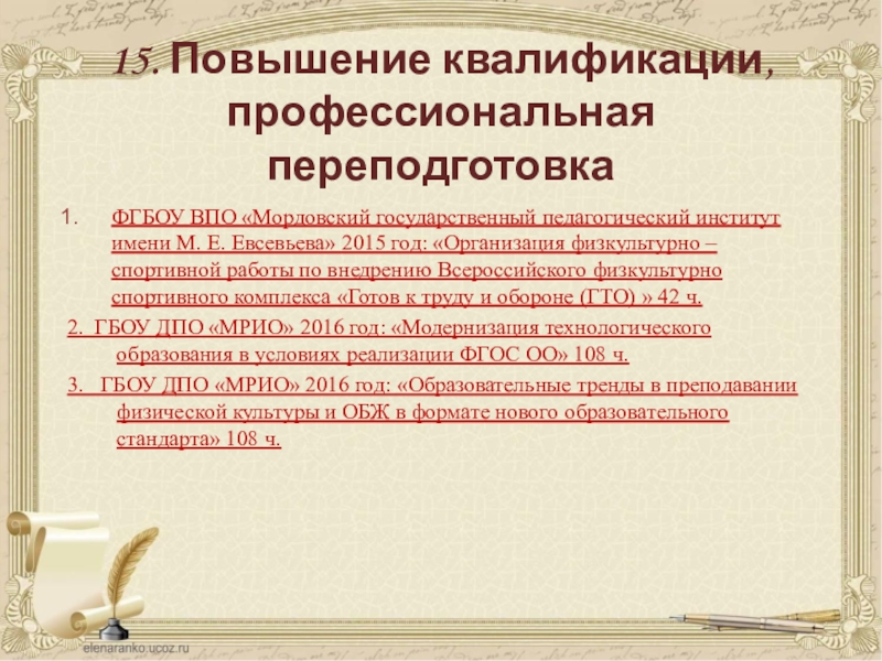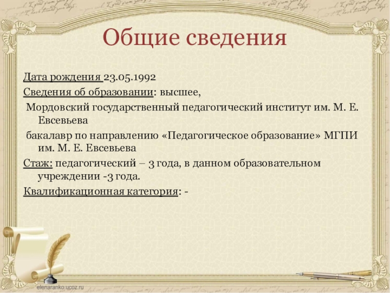 Профессиональное образование: бакалавр по направлению «Педагогическое образование» МГПИ им. М. Е. Евсевьева