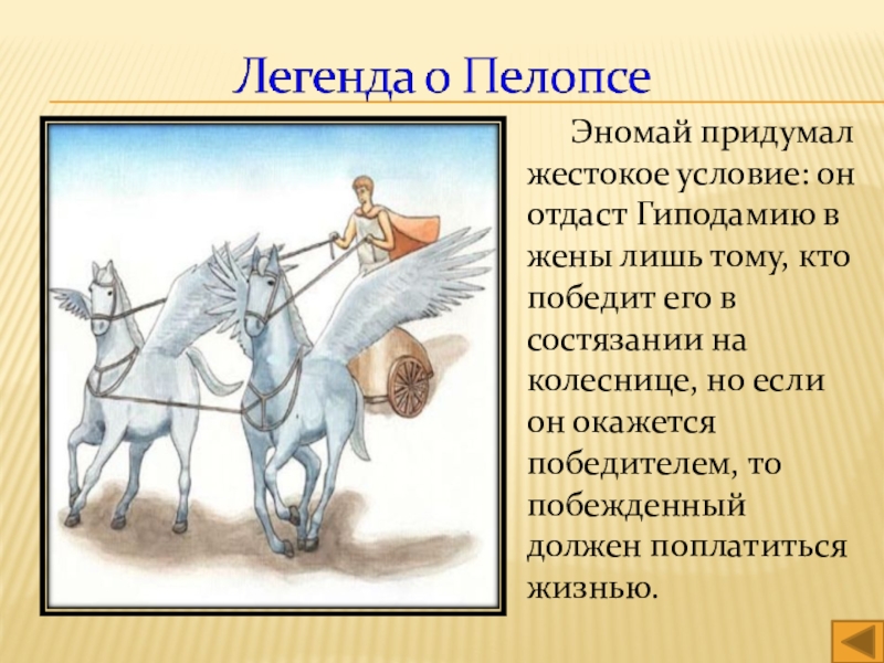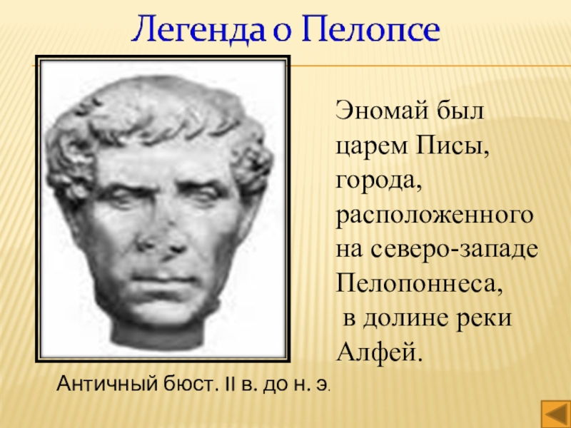 Слайд 10Эномай был царем Писы, города, расположенного на северо-западе Пелопоннеса,