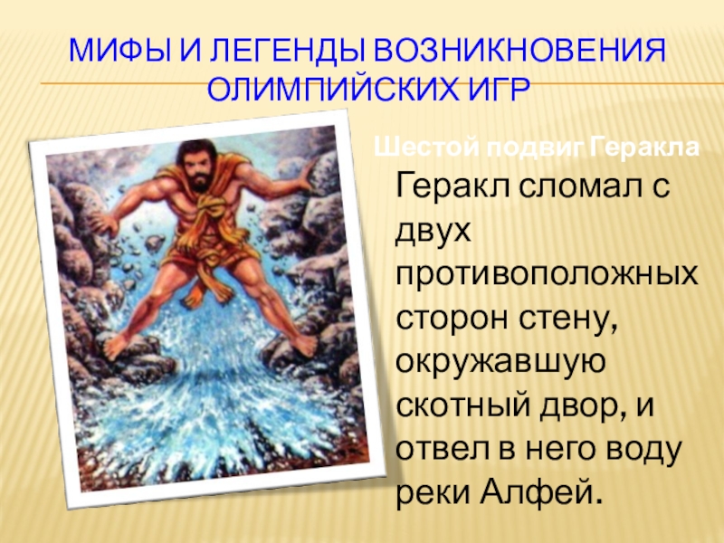 Мифы и легенды возникновения Олимпийских игрШестой подвиг ГераклаГеракл сломал с двух противоположных сторон стену, окружавшую скотный двор,