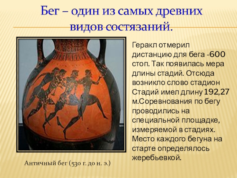 Античный бег (530 г. до н. э.)Геракл отмерил дистанцию для бега -600 стоп. Так появилась мера длины