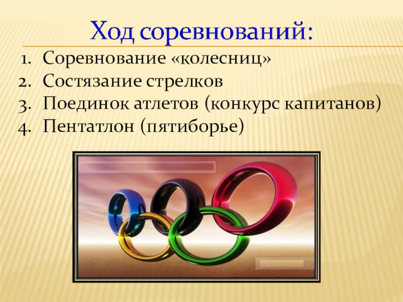 Соревнование «колесниц» Состязание стрелков Поединок атлетов (конкурс капитанов) Пентатлон (пятиборье)