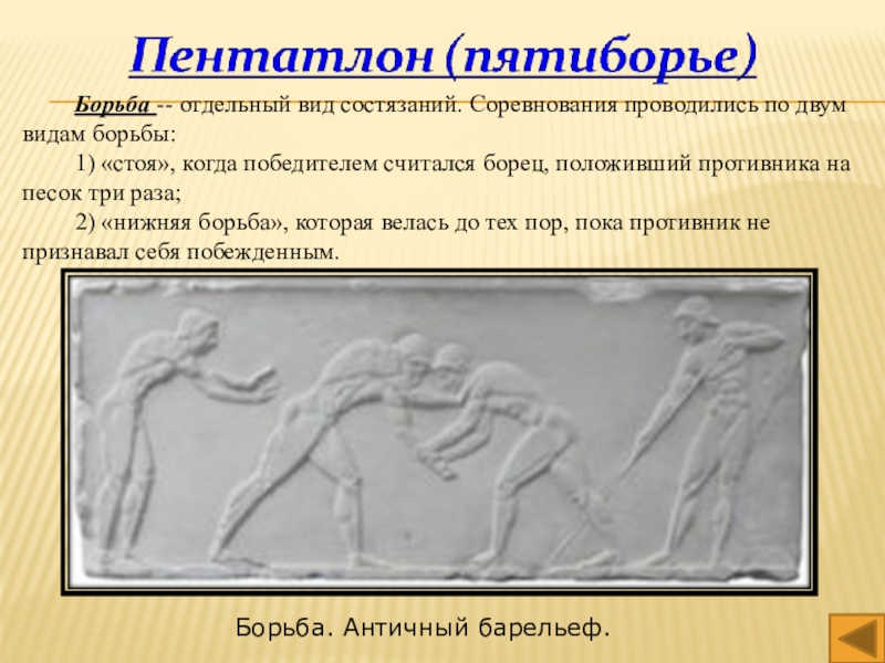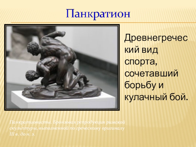 Слайд 18Древнегреческий вид спорта, сочетавший борьбу и кулачный бой.
