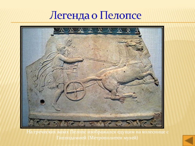 Слайд 13На греческих вазах Пелопс изображался едущим на колеснице с Гипподамией (Метрополитен