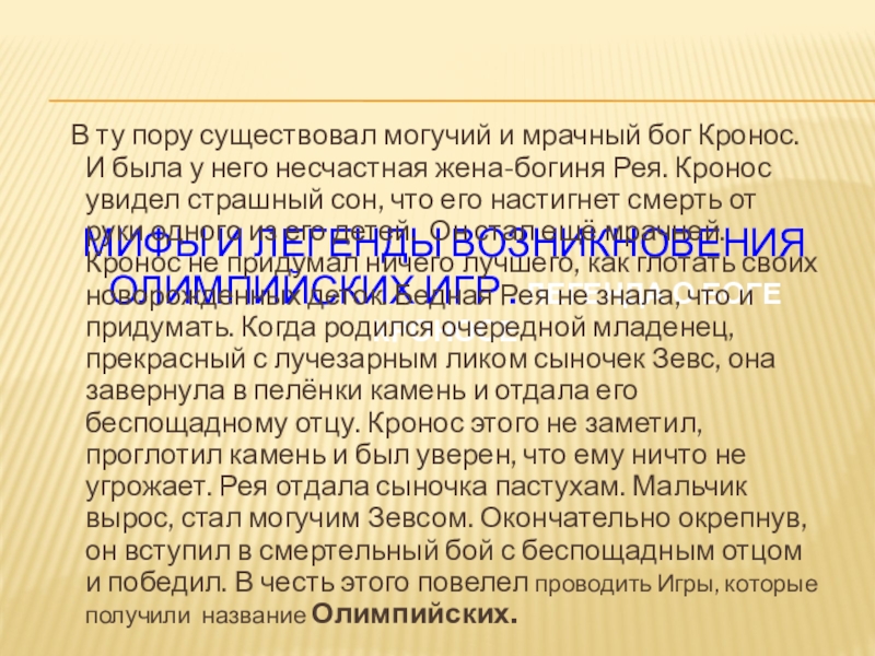 В ту пору существовал могучий и мрачный бог Кронос. И была у него несчастная жена-богиня Рея. Кронос увидел страшный сон, что его настигнет смерть от руки одного из его детей. Он стал ещё мрачней. Кронос не придумал ничего лучшего, как глотать своих новорожденных деток. Бедная Рея не знала, что и придумать. Когда родился очередной младенец, прекрасный с лучезарным ликом сыночек Зевс, она завернула в пелёнки камень и отдала его беспощадному отцу. Кронос этого не заметил, проглотил камень и был уверен, что ему ничто не угрожает. Рея отдала сыночка пастухам. Мальчик вырос, стал могучим Зевсом. Окончательно окрепнув, он вступил в смертельный бой с беспощадным отцом и победил. В честь этого повелел проводить Игры, которые получили название Олимпийских.