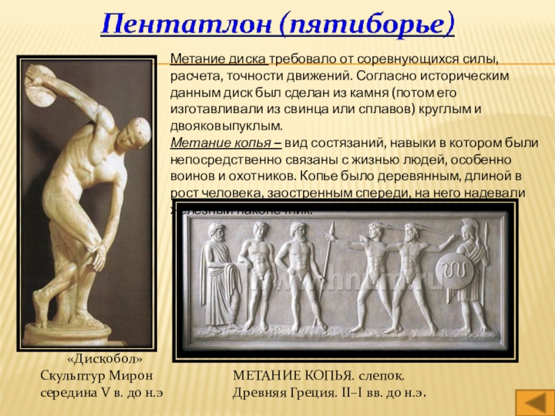 МЕТАНИЕ КОПЬЯ. слепок. Древняя Греция. II–I вв. до н.э.«Дискобол»     Скульптур Мирон середина V