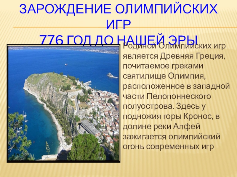Зарождение Олимпийских игр  776 год до нашей эрыРодиной Олимпийских игр является Древняя Греция, почитаемое греками
