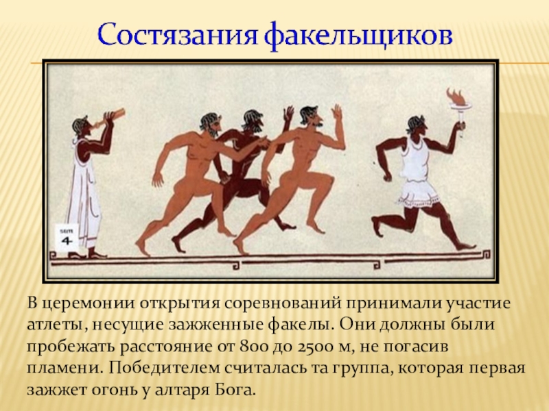 должны были пробежать расстояние от 800 до 2500 м, не погасив пламени. Победителем считалась та группа, которая первая зажжет огонь у алтаря Бога.