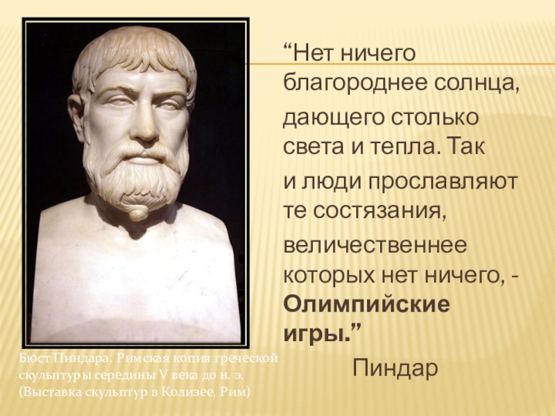 “Нет ничего благороднее солнца,дающего столько света и тепла. Таки люди прославляют те состязания,величественнее которых нет ничего, -