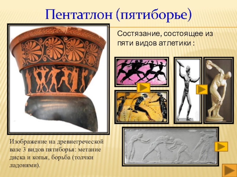 Слайд 20Изображение на древнегреческой вазе 3 видов пятиборья: метание диска и копья,