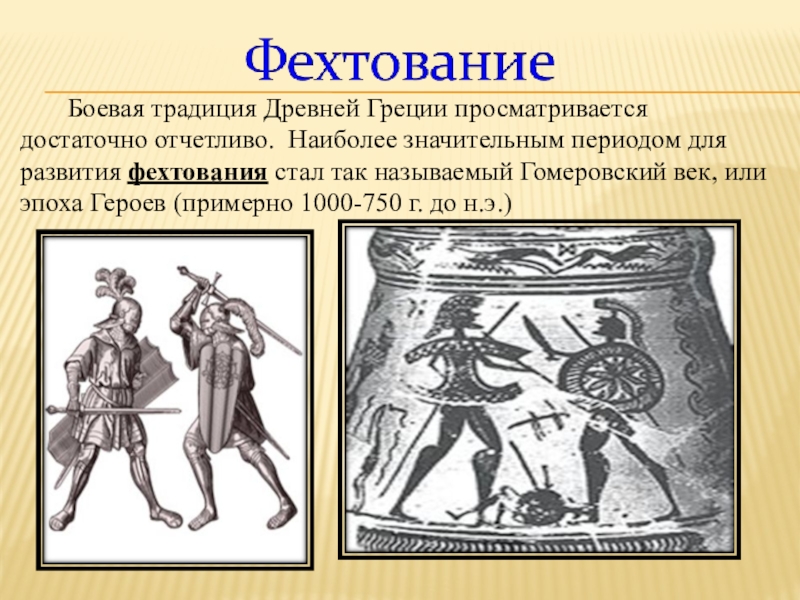 Боевая традиция Древней Греции просматривается достаточно отчетливо. Наиболее значительным периодом для развития фехтования стал так называемый Гомеровский