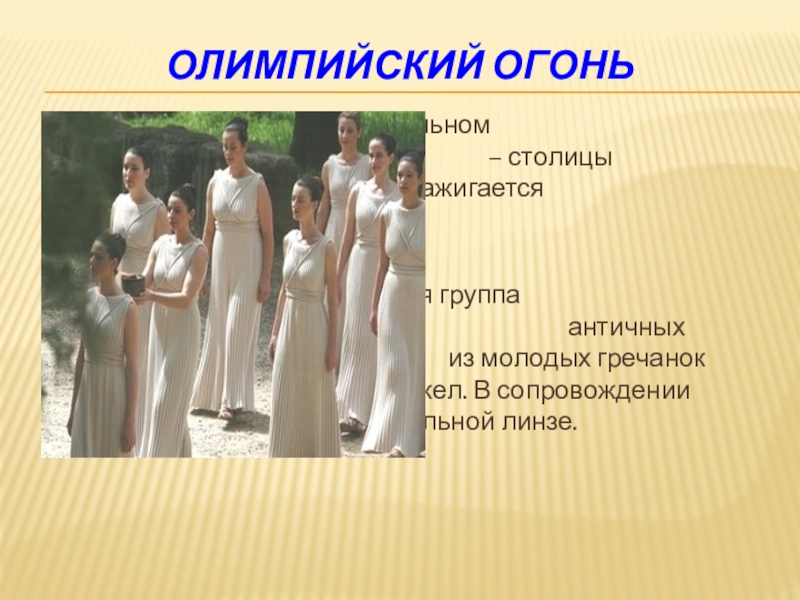 группа девушек в белоснежных античных туниках. Одна из молодых гречанок держит в руке факел. В сопровождении подруг она подходит к зеркальной линзе.