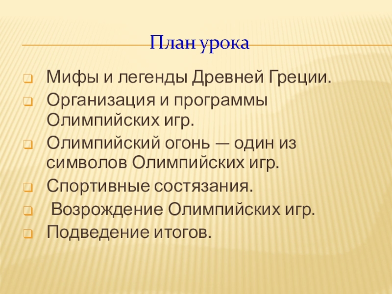 Мифы и легенды Древней Греции.Организация и программы  Олимпийских игр.Олимпийский огонь — один из символов Олимпийских игр.Спортивные