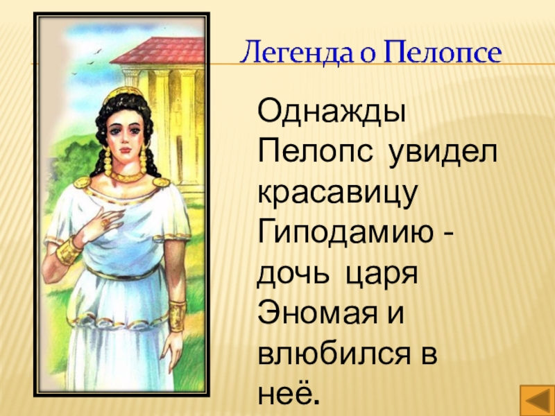 Слайд 11Однажды Пелопс увидел красавицу Гиподамию - дочь царя Эномая и влюбился