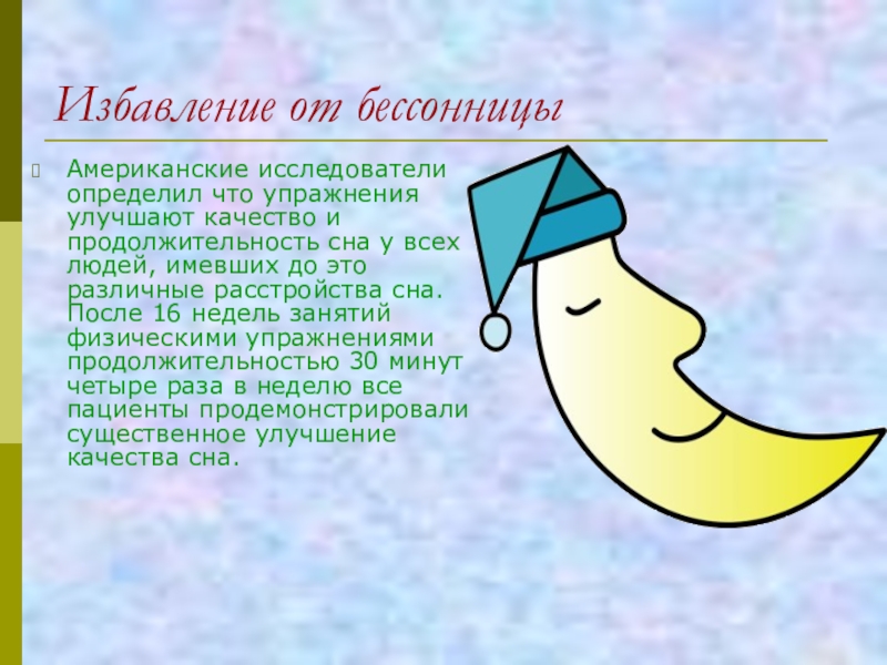 продолжительность сна у всех людей, имевших до это различные расстройства сна. После 16 недель занятий физическими упражнениями продолжительностью 30 минут четыре раза в неделю все пациенты продемонстрировали существенное улучшение качества сна.