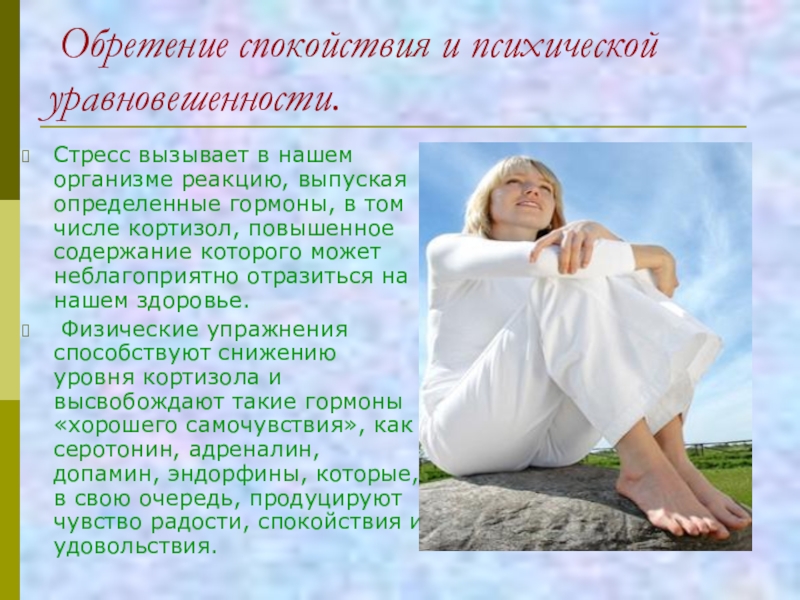 Слайд 6 Обретение спокойствия и психической уравновешенности.