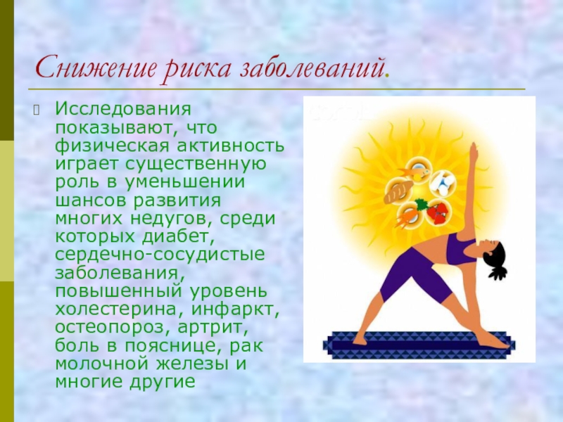 уменьшении шансов развития многих недугов, среди которых диабет, сердечно-сосудистые заболевания, повышенный уровень холестерина, инфаркт, остеопороз, артрит, боль в пояснице, рак молочной железы и многие другие