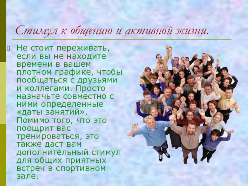 находите времени в вашем плотном графике, чтобы пообщаться с друзьями и коллегами. Просто назначьте совместно с ними определенные «даты занятий». Помимо того, что это поощрит вас тренироваться, это также даст вам дополнительный стимул для общих приятных встреч в спортивном зале.