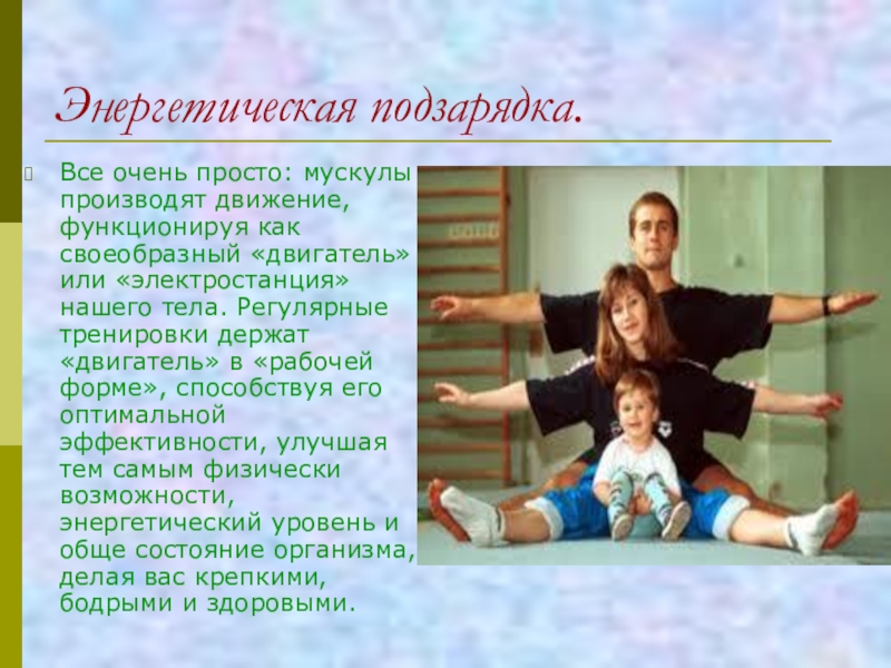 или «электростанция» нашего тела. Регулярные тренировки держат «двигатель» в «рабочей форме», способствуя его оптимальной эффективности, улучшая тем самым физически возможности, энергетический уровень и обще состояние организма, делая вас крепкими, бодрыми и здоровыми.