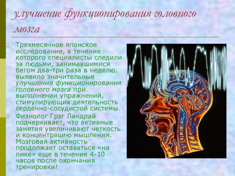 следили за людьми, занимавшимися бегом два-три раза в неделю, выявило значительные улучшения функционирования головного мозга при выполнении упражнений, стимулирующих деятельность ceрдечно-сосудистой системы.