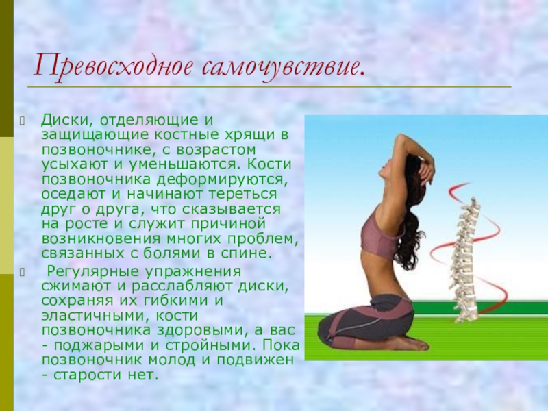 Регулярные упражнения сжимают и расслабляют диски, сохраняя их гибкими и эластичными, кости позвоночника здоровыми, а вас - поджарыми и стройными. Пока позвоночник молод и подвижен - старости нет.