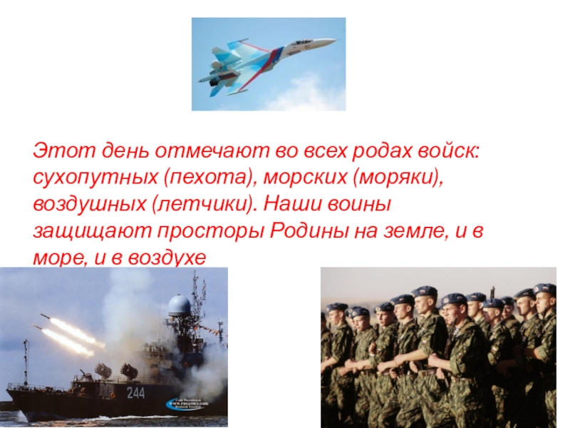 Слайд 4Этот день отмечают во всех родах войск: сухопутных (пехота), морских (моряки),