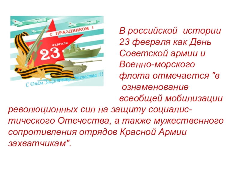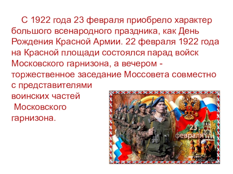 праздника, как День Рождения Красной Армии. 22 февраля 1922 года на Красной площади состоялся парад войск Московского гарнизона, а вечером - торжественное заседание Моссовета совместно с представителями