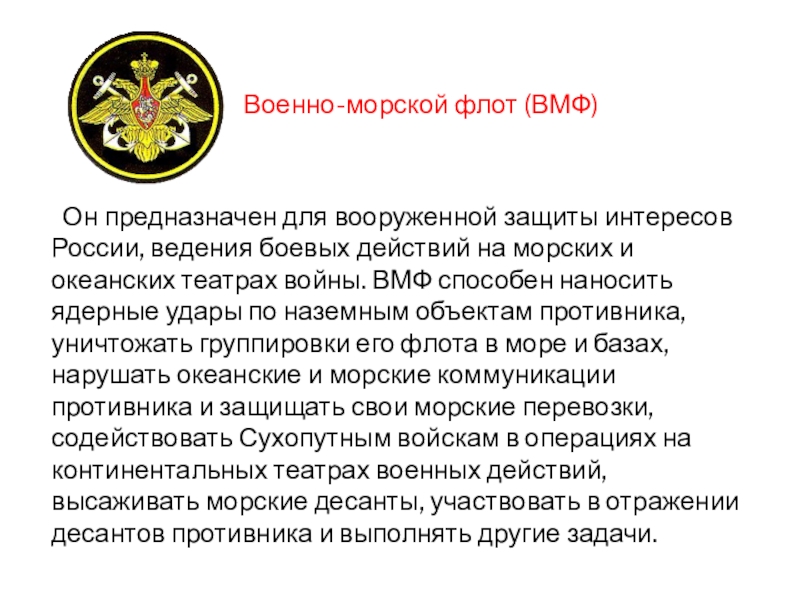 Он предназначен для вооруженной защиты интересов России, ведения боевых действий на морских и океанских театрах войны. ВМФ способен наносить ядерные удары по наземным объектам противника, уничтожать группировки его флота в море и базах, нарушать океанские и морские коммуникации противника и защищать свои морские перевозки, содействовать Сухопутным войскам в операциях на континентальных театрах военных действий, высаживать морские десанты, участвовать в отражении десантов противника и выполнять другие задачи.