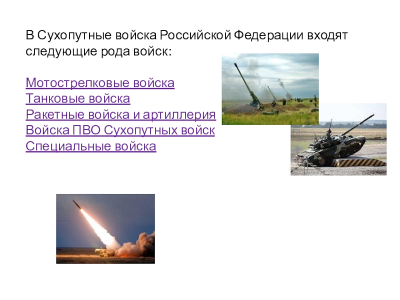 Слайд 6В Сухопутные войска Российской Федерации входят следующие рода войск :