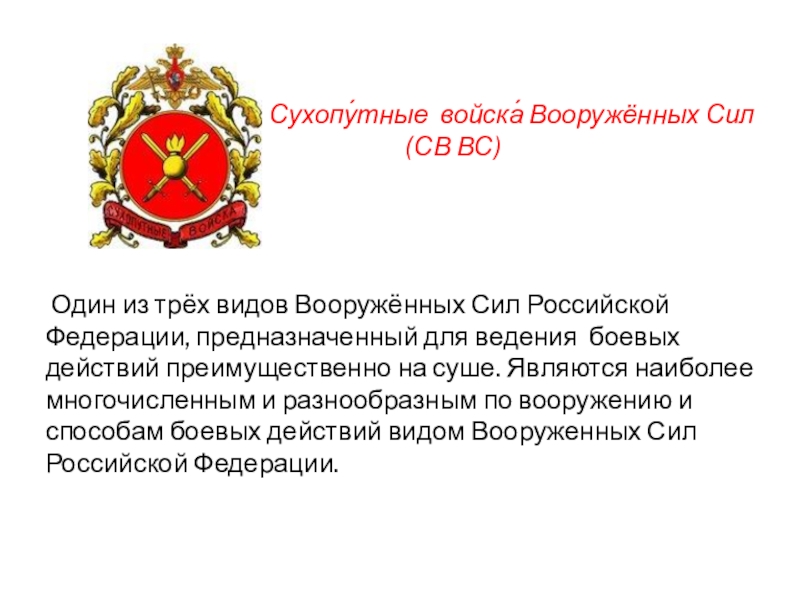 Один из трёх видов Вооружённых Сил Российской Федерации, предназначенный для ведения боевых действий преимущественно на суше. Являются наиболее многочисленным и разнообразным по вооружению и способам боевых действий видом Вооруженных Сил Российской Федерации.