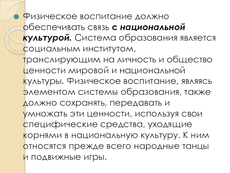 Слайд 26Физическое воспитание должно обеспечивать связь с национальной культурой. Система образования является