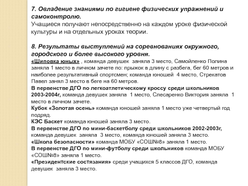 Слайд 347. Овладение знаниями по гигиене физических упражнений и самоконтролю.
