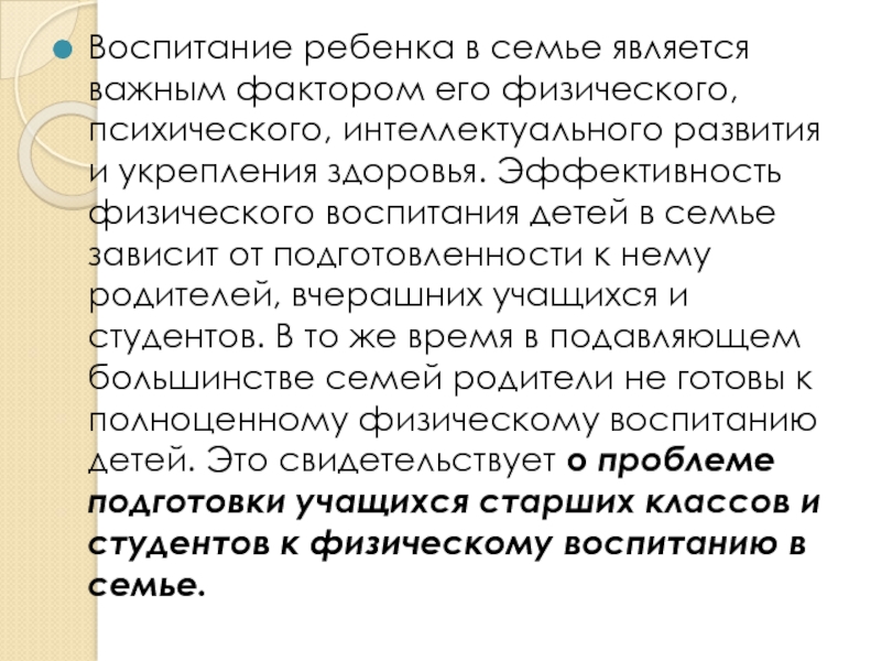 развития и укрепления здоровья. Эффективность физического воспитания детей в семье зависит от подготовленности к нему родителей, вчерашних учащихся и студентов. В то же время в подавляющем большинстве семей родители не готовы к полноценному физическому воспитанию детей. Это свидетельствует о проблеме подготовки учащихся старших классов и студентов к физическому воспитанию в семье.