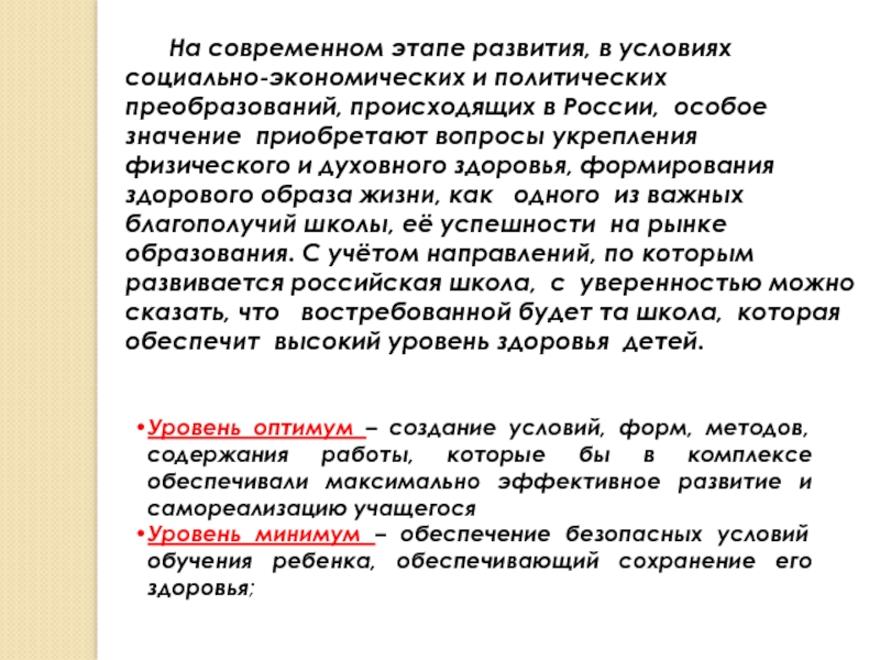 в России, особое значение приобретают вопросы укрепления физического и духовного здоровья, формирования здорового образа жизни, как одного из важных благополучий школы, её успешности на рынке образования. С учётом направлений, по которым развивается российская школа, с уверенностью можно сказать, что востребованной будет та школа, которая обеспечит высокий уровень здоровья детей.