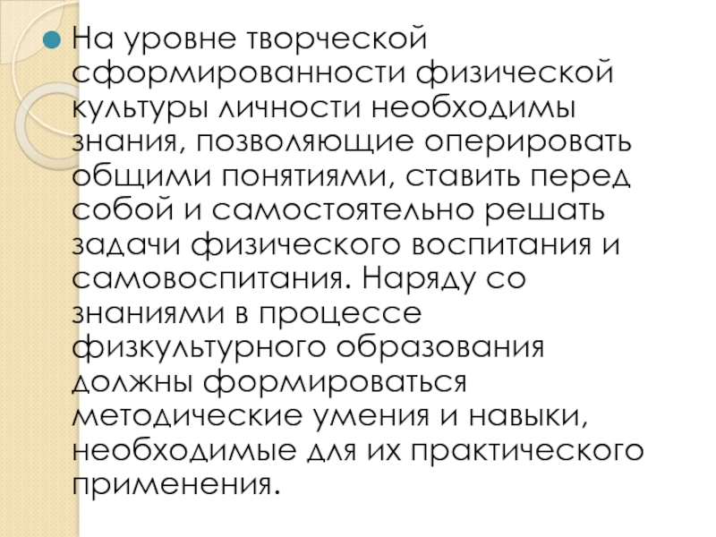 Слайд 21На уровне творческой сформированности физической культуры личности необходимы знания, позволяющие оперировать