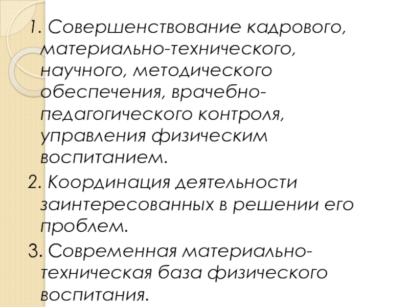 Слайд 291. Совершенствование кадрового, материально-технического, научного, методического обеспечения, врачебно-педагогического контроля, управления физическим