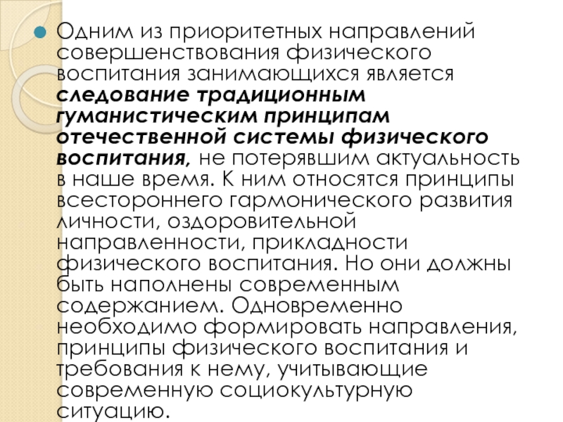 гуманистическим принципам отечественной системы физического воспитания, не потерявшим актуальность в наше время. К ним относятся принципы всестороннего гармонического развития личности, оздоровительной направленности, прикладности физического воспитания. Но они должны быть наполнены современным содержанием. Одновременно необходимо формировать направления, принципы физического воспитания и требования к нему, учитывающие современную социокультурную ситуацию.