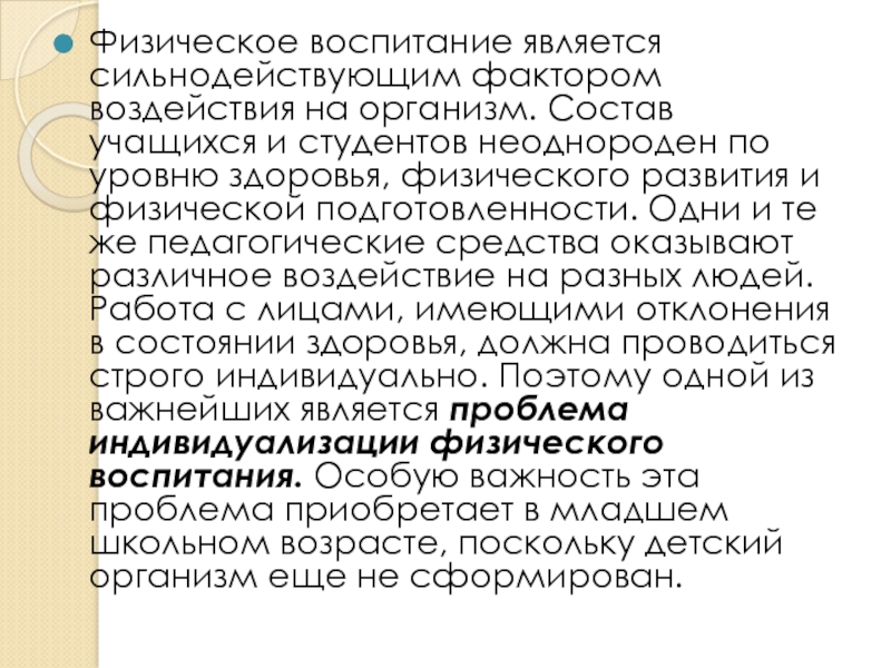 студентов неоднороден по уровню здоровья, физического развития и физической подготовленности. Одни и те же педагогические средства оказывают различное воздействие на разных людей. Работа с лицами, имеющими отклонения в состоянии здоровья, должна проводиться строго индивидуально. Поэтому одной из важнейших является проблема индивидуализации физического воспитания. Особую важность эта проблема приобретает в младшем школьном возрасте, поскольку детский организм еще не сформирован.