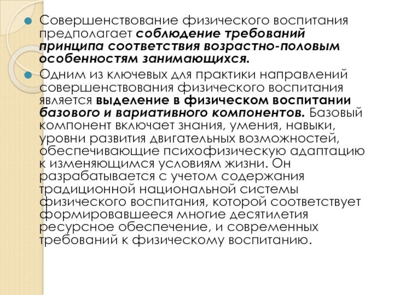 из ключевых для практики направлений совершенствования физического воспитания является выделение в физическом воспитании базового и вариативного компонентов. Базовый компонент включает знания, умения, навыки, уровни развития двигательных возможностей, обеспечивающие психофизическую адаптацию к изменяющимся условиям жизни. Он разрабатывается с учетом содержания традиционной национальной системы физического воспитания, которой соответствует формировавшееся многие десятилетия ресурсное обеспечение, и современных требований к физическому воспитанию.