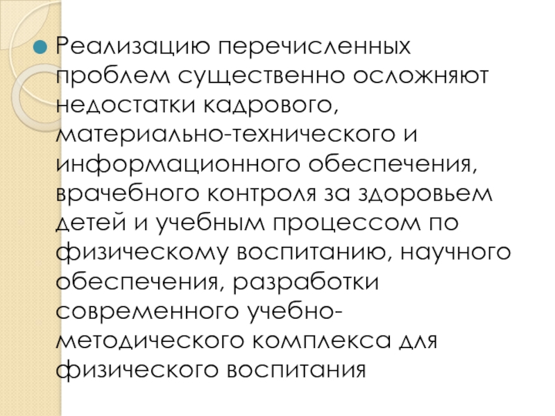 Слайд 16Реализацию перечисленных проблем существенно осложняют недостатки кадрового, материально-технического и информационного обеспечения,