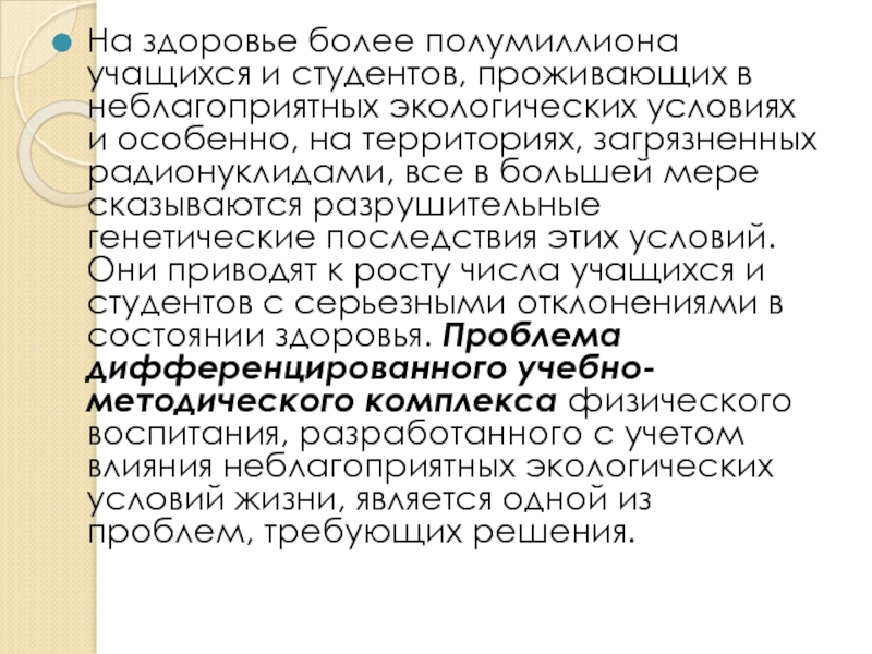 условиях и особенно, на территориях, загрязненных радионуклидами, все в большей мере сказываются разрушительные генетические последствия этих условий. Они приводят к росту числа учащихся и студентов с серьезными отклонениями в состоянии здоровья. Проблема дифференцированного учебно-методического комплекса физического воспитания, разработанного с учетом влияния неблагоприятных экологических условий жизни, является одной из проблем, требующих решения.