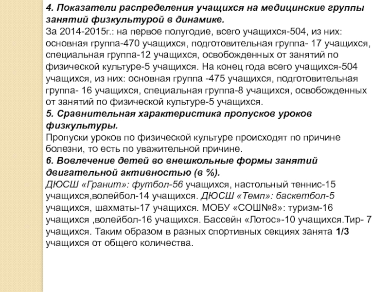 За 2014-2015г.: на первое полугодие, всего учащихся-504, из них: основная группа-470 учащихся, подготовительная группа- 17 учащихся, специальная группа-12 учащихся, освобожденных от занятий по физической культуре-5 учащихся. На конец года всего учащихся-504 учащихся, из них: основная группа -475 учащихся, подготовительная группа- 16 учащихся, специальная группа-8 учащихся, освобожденных от занятий по физической культуре-5 учащихся.