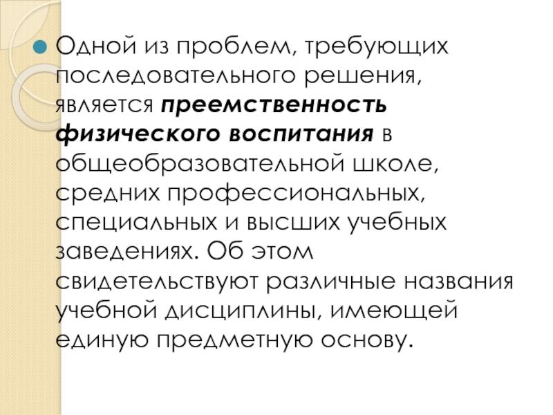 Слайд 11Одной из проблем, требующих последовательного решения, является преемственность физического воспитания в