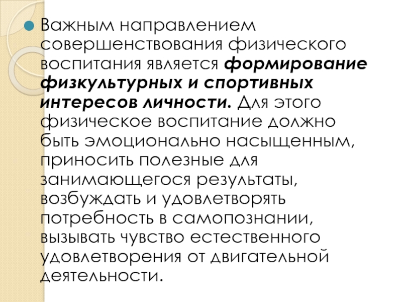 Слайд 22Важным направлением совершенствования физического воспитания является формирование физкультурных и спортивных интересов