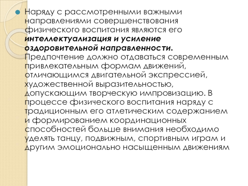 и усиление оздоровительной направленности. Предпочтение должно отдаваться современным привлекательным формам движений, отличающимся двигательной экспрессией, художественной выразительностью, допускающим творческую импровизацию. В процессе физического воспитания наряду с традиционным его атлетическим содержанием и формированием координационных способностей больше внимания необходимо уделять танцу, подвижным, спортивным играм и другим эмоционально насыщенным движениям