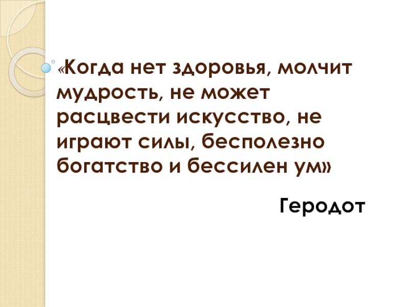 Слайд 2«Когда нет здоровья, молчит мудрость, не может расцвести искусство, не