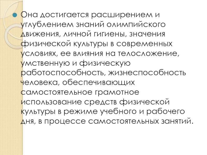 Слайд 20Она достигается расширением и углублением знаний олимпийского движения, личной гигиены, значения