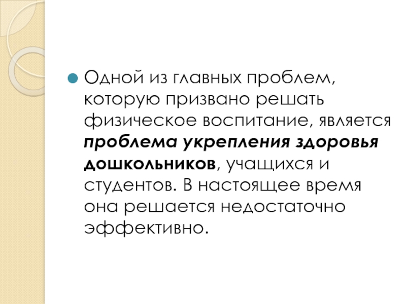 Слайд 13Одной из главных проблем, которую призвано решать физическое воспитание, является проблема