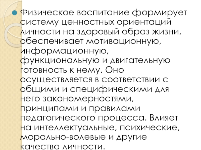 Слайд 7Физическое воспитание формирует систему ценностных ориентаций личности на здоровый образ жизни,